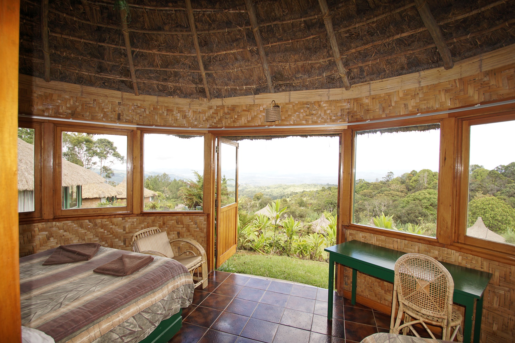 Guests can enjoy the colourful gardens and unparalleled vista from the outside dining area which is complete with a cosy fireplace for the cool highland evenings. The power is supplied by the lodge’s own hydro system, providing environmentally friendly electricity. Comprehensive touring programs offer insight into the fascinating cultural traditions and customs of the Melpa tribe, who populate this area of PNG. In order for guests to experience the cultural history of the region as well as its natural beauty, new cultural center and museum Bates House Tumbuna opened at Rondon Ridge on 16 September, 2025. With daily flights from Port Moresby to Hagen, Rondon Ridge is the perfect jumping-off point for access to Ambua Lodge, Karawari Lodge, Lake Murray Lodge and the Sepik Spirit.