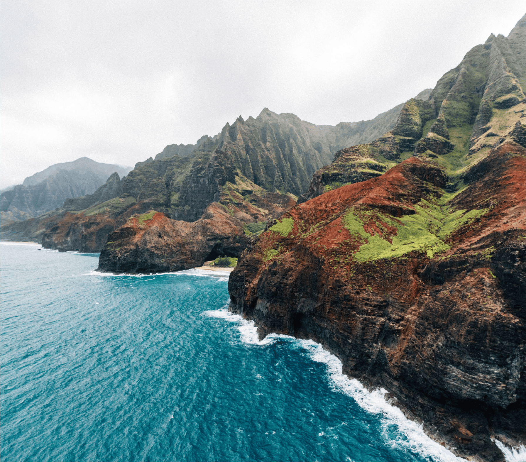 On the island’s north shore the scenery runs riot, grey mists hang over the sheer Napali cliffs, waterfalls tumble into deep valleys.