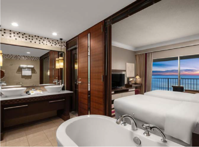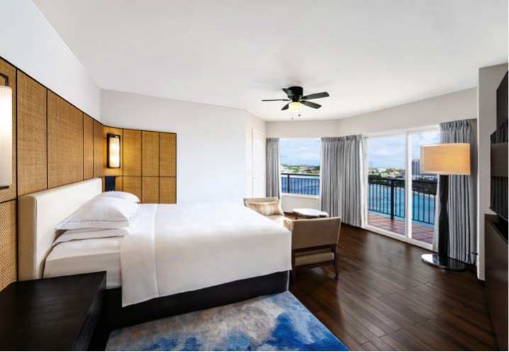 Surrounded by the crystal-clear waters of Guam, this spectacular, wing-shaped deluxe resort hotel is nestled between Tumon Bay and Gun Beach. All 470 spacious luxury hotel rooms and suites offer private balconies and ocean views, complemented by the beautiful sunsets and breathtaking views of the Pacific. Modern conveniences include complimentary Wi-Fi and cable TV.