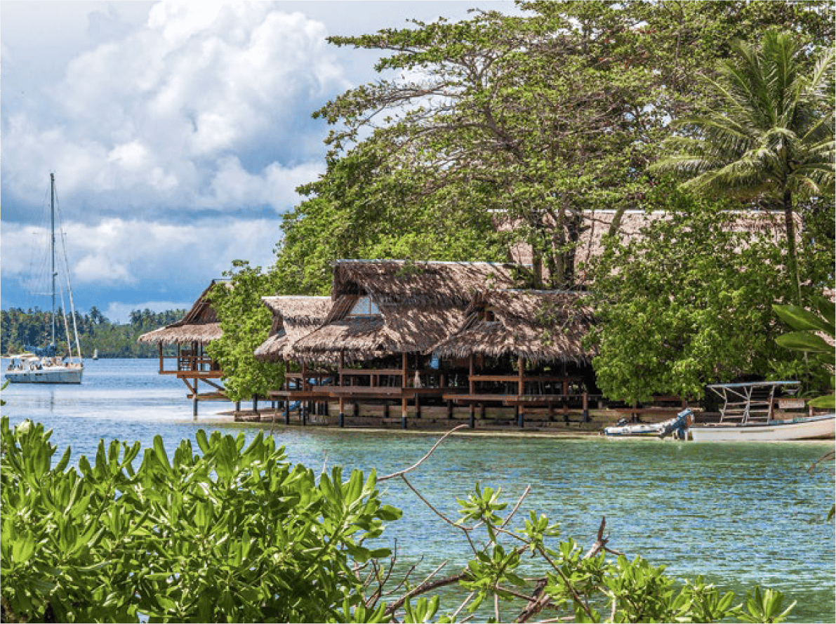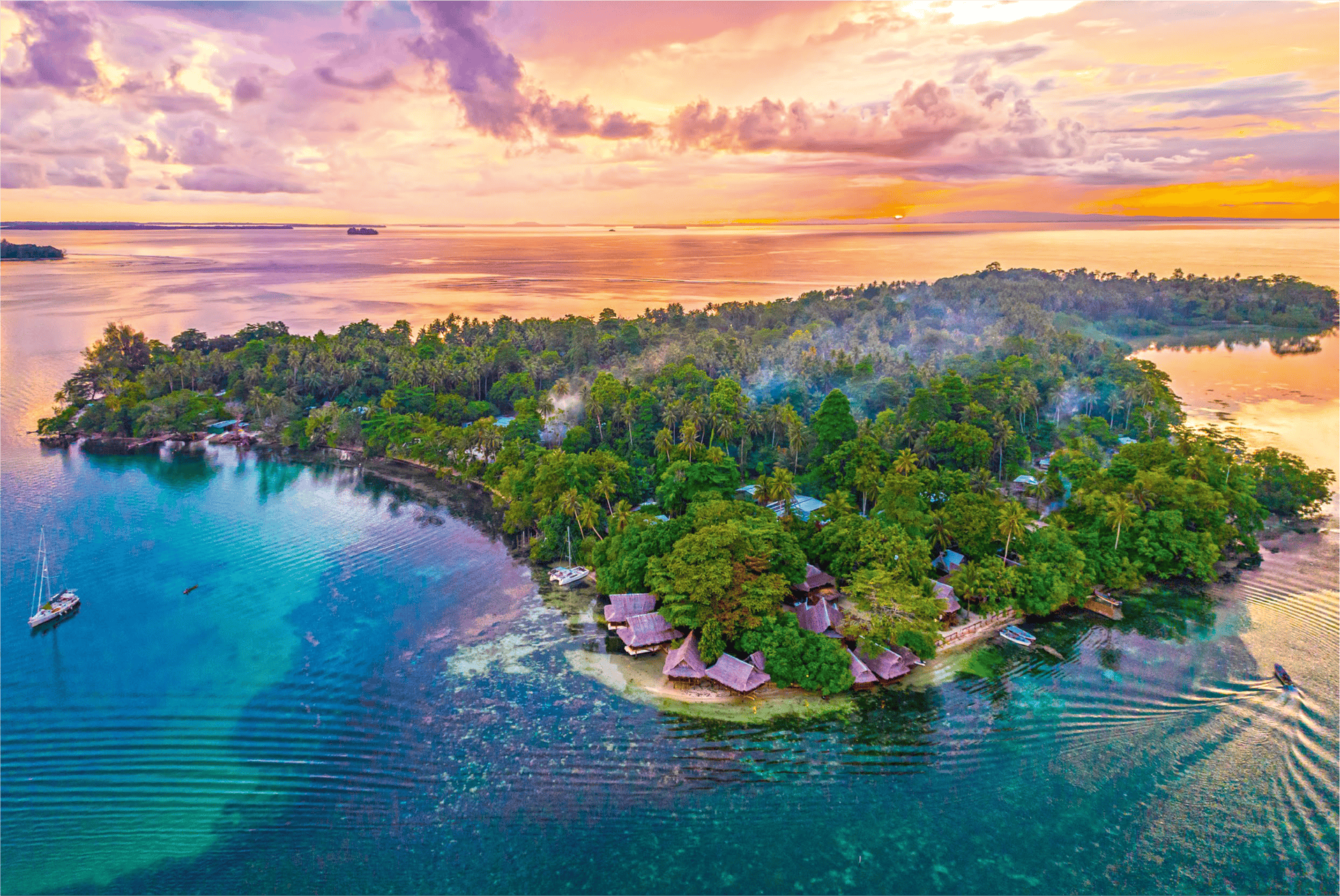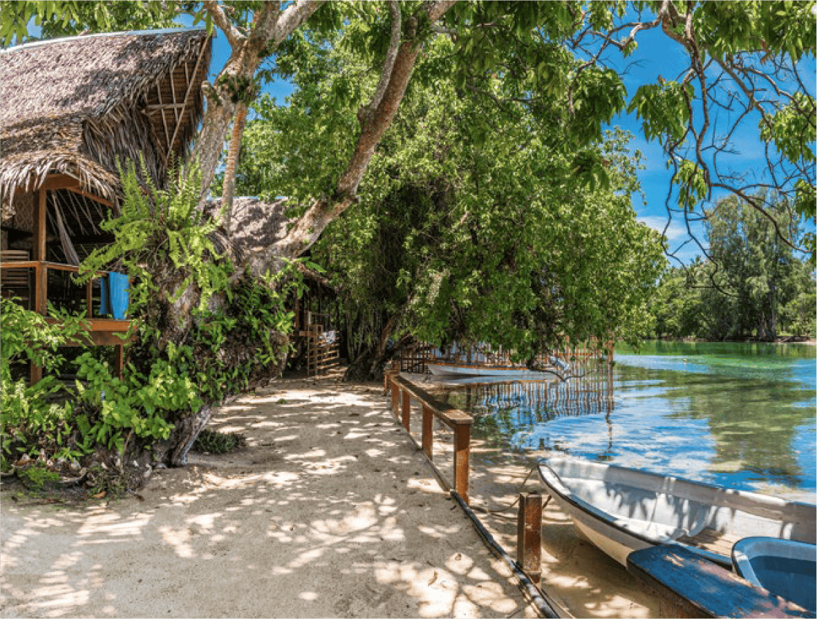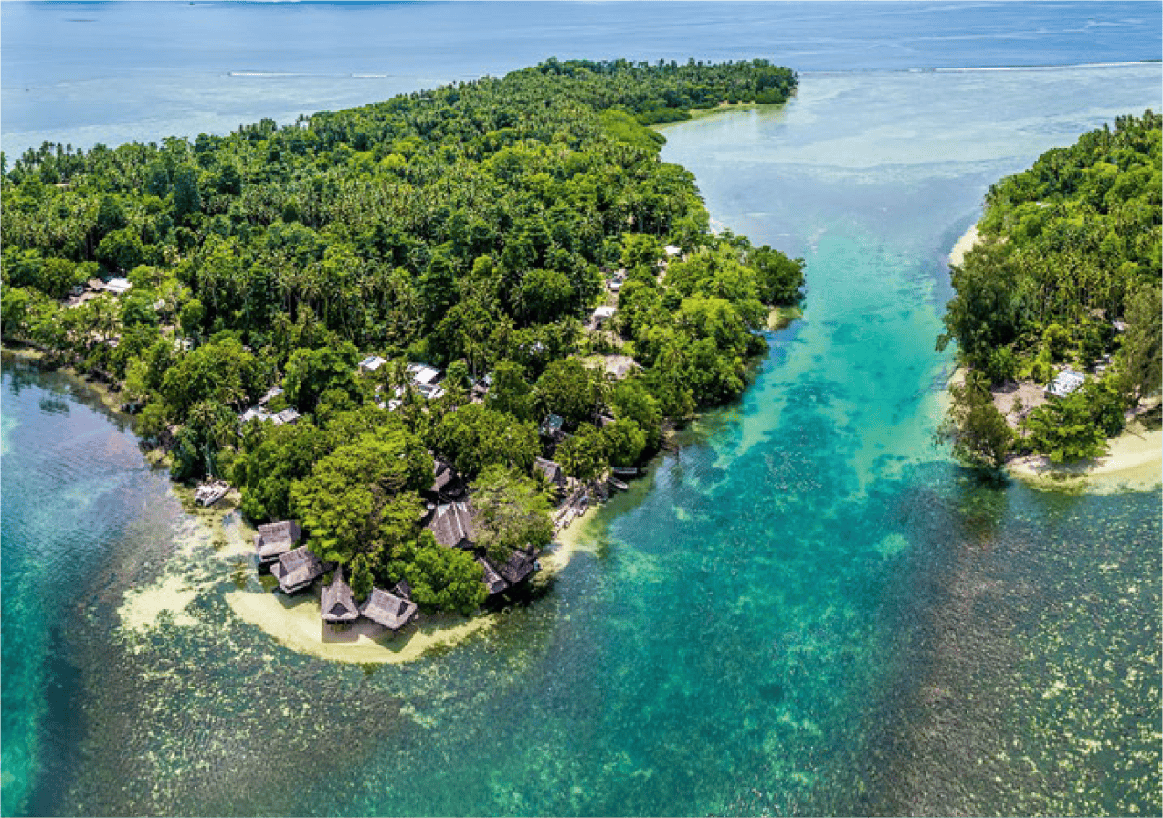 Nestled on a sheltered white sandy point, Nusa Island Retreat offers safe swimming and amazing views across the blues of Kavieng Harbour.